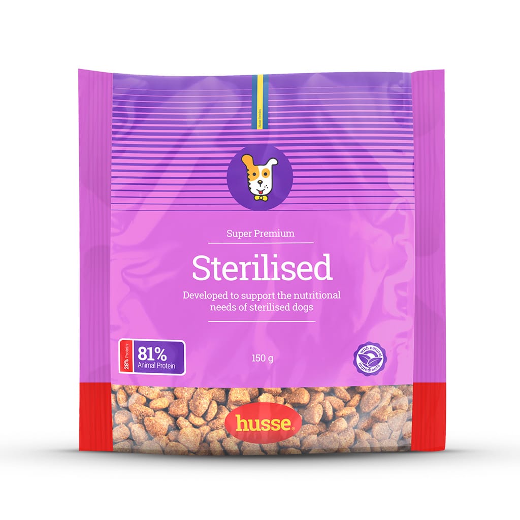 Sterilised har lägre energinivå, högt proteininnehåll och L-karnitin för att underlätta metabolismen av fetter. Anpassat recept för att tillgodose behoven hos kastrerade hundar.